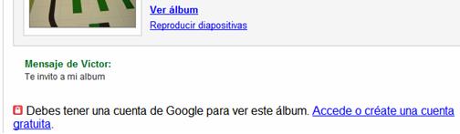 Cuando se pulsa el botón Enviar correo electrónico Picasaweb envía un mensaje a los destinatarios, que reciben en su bandeja de correo: