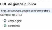http://picasaweb.google.es/<nombre_del_usuario>/<nombre_del_álbum>authkey=Ak0XXF2An8E Como se observa, Picasaweb añade ahora una clave variable a la dirección para que nadie acceda al álbum sin que su propietario lo consienta. No obstante, si éste comunica a otro usuario dicha dirección completa, el último podría ver el álbum. Y, además, el propietario puede compartir este álbum con otros usuarios (como se verá a continuación). Pero en ningún caso este álbum puede ser localizado mediante búsqueda basada en etiquetas.